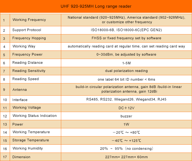 The UHF RFID Middle Range Reader is a high performance UHF integrated reader .Based on proprietary efficient digital signal processing algorithm, it supports fast tag read/write operation with high identification rate. It can be widely applied in many RFID application systems such aslogistics, access control,and anti-counterfeit and industrial production process control system.